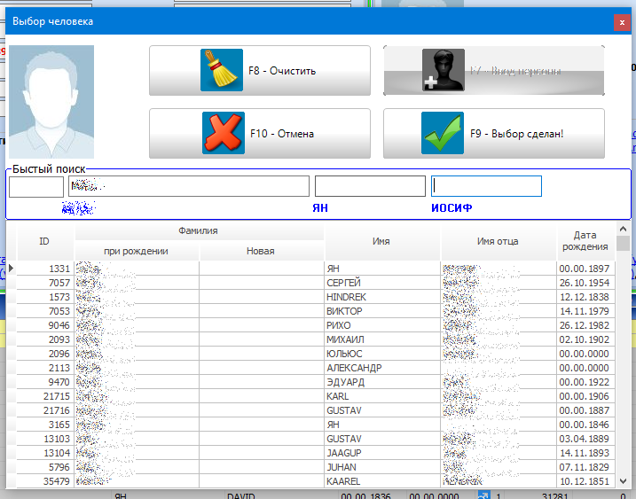 Для выбора требуемой персоны необходимо ввести начальные буквы фамилии, имени, отчества в